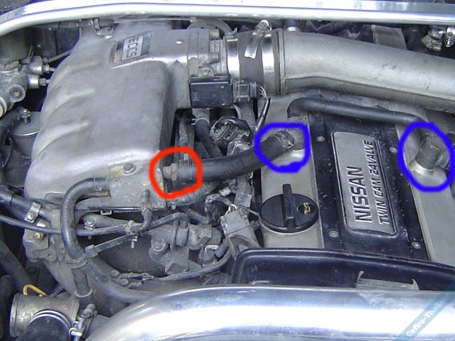ถ้าจะอุดวงสีแดงที่อยู่บนท่อไอดีก็สามารถอุดได้ แต่ควรจะต่อสายยางจากฝาครอบวาล์ว(ที่วงสีน้ำเงิน) ไปลงที่ถังดักไอน้ำมันเครื่องครับ