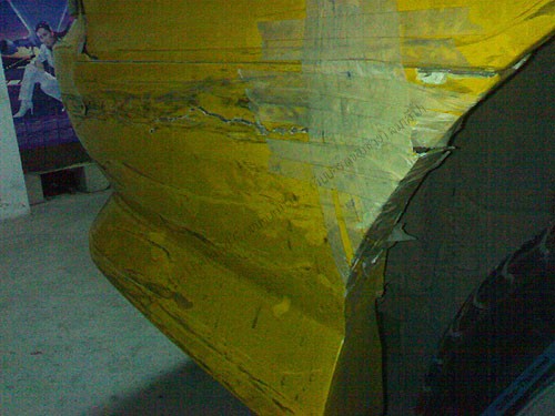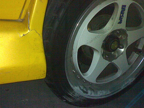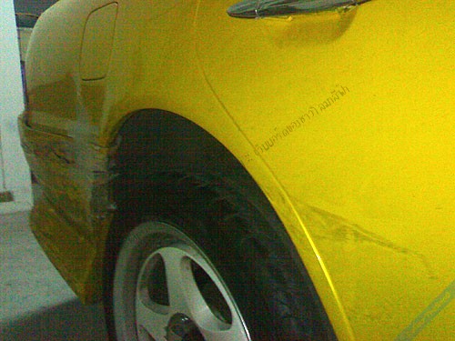 ความเสียหาย ก็มีตามรูปน่ะครับ กันชนหลังซีกขวาแตก แล้วก็บังโคลนหลังขวา ถึงประตูนิดหน่อยก็บุบ กับมีรอยถลอกที่ล้อหน่อยนึง (ดีนะล้อรถผม 8 นิ้ว มันเลยไม่ปลิ้นออกมา ไม่งั้นล้อคงรับไปเต็มๆ)