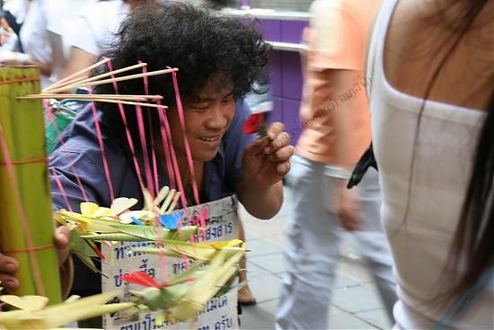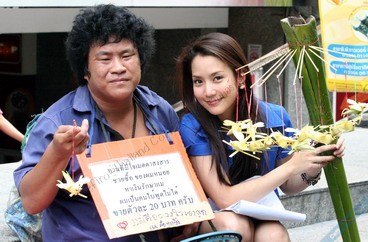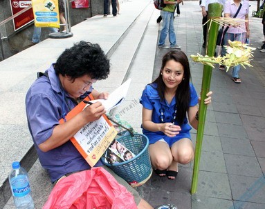 มีสาวๆแต่งตัวดีมากกลุ่มนึงเดินมา น้องจั๊กจั่นเลยตรงเข้าไปชวนเค้าทำบุญ