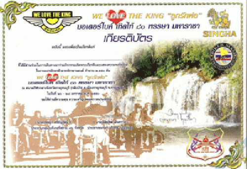 งาน MC นู๋ก้อไปมา จะรวมรถมอไซ หลายๆ ประเภท เช่น ช๊อปเปอร์ ฮาร์เลย์ ฮอนด้าซี สี่สูบ โกวิง หน้ายาว ......... แต่งานนั้นนู๋ได้เอาซีไปมา ....... เพราะตอนแรกคิดว่าเปงงานซี ไปๆมาๆ รถเยอะมากๆ ............. ที่สำคัน ตอนกลางคืนก้อมีคอนเสริต์ แล้วก้อกางเต้นท์นอนที่นั่น ได้บรรยากาศดีมากๆ แล้วรูปภาพคำว่า we love the king เค้าได้ขับฮอล์ถ่ายในงานมากลางสนามกีฬา แต่กว่าจะไปตัวอักษรที่สวยงามได้ ใช้เวลาตั้งแต่เช้าถึงเย้น เพราะรถที่เข้างาน ทะยอยกานมาเรื่อยๆ ไม่ได้มาพร้อมกานทีเด่ว ก้อรอรถไปจัดไปเรื่อยๆกว่าจะได้เปงคำนี้ขึ้นมา เหงรถที่จอดในสนามแล้วบางคันมาช้า ก้อไม่ได้ เข้าไปร่วมแปลตัวอักษร........ของหนูไป ได้ซื้อเสื้อมา 2 ตัว เพราะเสื้อเค้าขายแล้วแต่ใครจะซื้อก้อได้ไม่ซื้อก้อได้ แล้วก้อได้เกียรติบัตรแต่เกียรติบัตรมี 2 แบบแหละก้อเข้มกลัด...........ก้อถือว่างานนี้หนุกหนานเอฮา ขำๆ กันไป.........ยิ่งดึกยิ่งมันมากๆ