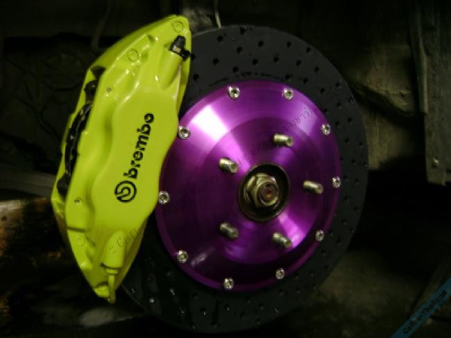 อันนี้ผมไปเจออยู่เวปหนึ่ง เค้ารับทำสีพร้อมเลย แต่ถ้าเราทำอันสีม่วงๆ ให้โรงกลึง กลึงและทำสีจะแพงไหมหนิ และมันจะพังง่ายไหมหนิ เห็นสวยดี (รูปนี้เป็นเบรก R32 ทำใหม่หมด)